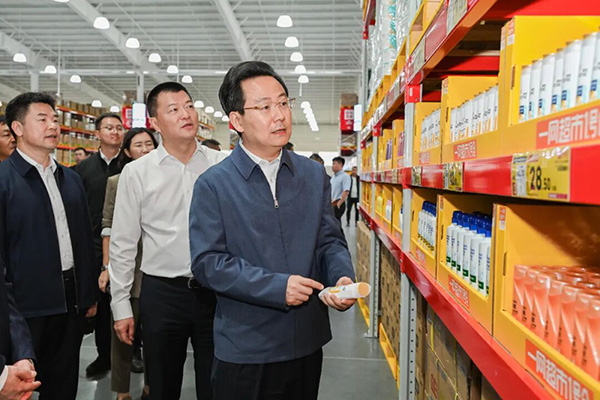 市委书记胡斌(右)在统泰一网超市总部园区批发仓储基地,实地检查供应链仓储销售中心“1 号仓”项目运营情况及节日市场供应、消防安全等情况。