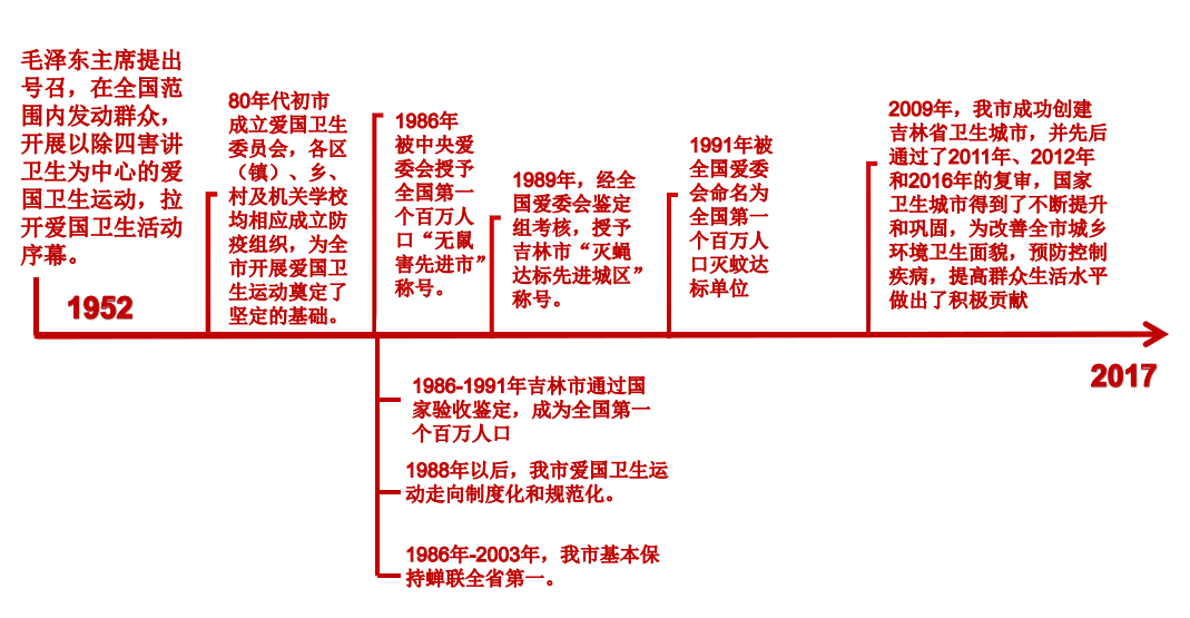 吉林市的卫生城市创建工作回顾。1986年开始创建卫生城市以来,市委、市政府始终把创建卫生城市作为加强两个文明建设、加快城市经济发展、提高人民生活质量的大事来抓。各级政府高度重视,成员部门密切配合,爱国卫生工作曾经取得丰硕成果:我市1986年率先实现全国灭鼠达标,通过国家验收;1990年成为全国卫生城市、1991年除四害全面达标,成为全国第一个百万人口卫生城市除四害全面达标市;1992年跻身“全国十佳卫生城市”行列;1994年开始迎接全国第四次城市卫生检查评比顺利通过;1995年再次获得“全国卫生城市”称号;在全省九个地(州)市竞赛联评中,吉林市连续多年名列榜首。