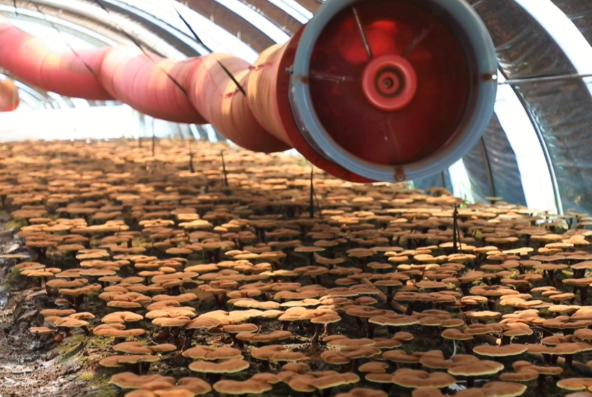 走进磐石市朝阳山镇大快当村赵大院屯灵芝种植基地,一座座大棚整齐排列,一株株大小各异、形态万千的灵芝铺满地面,棚内鼓风机全天候回收孢子粉。