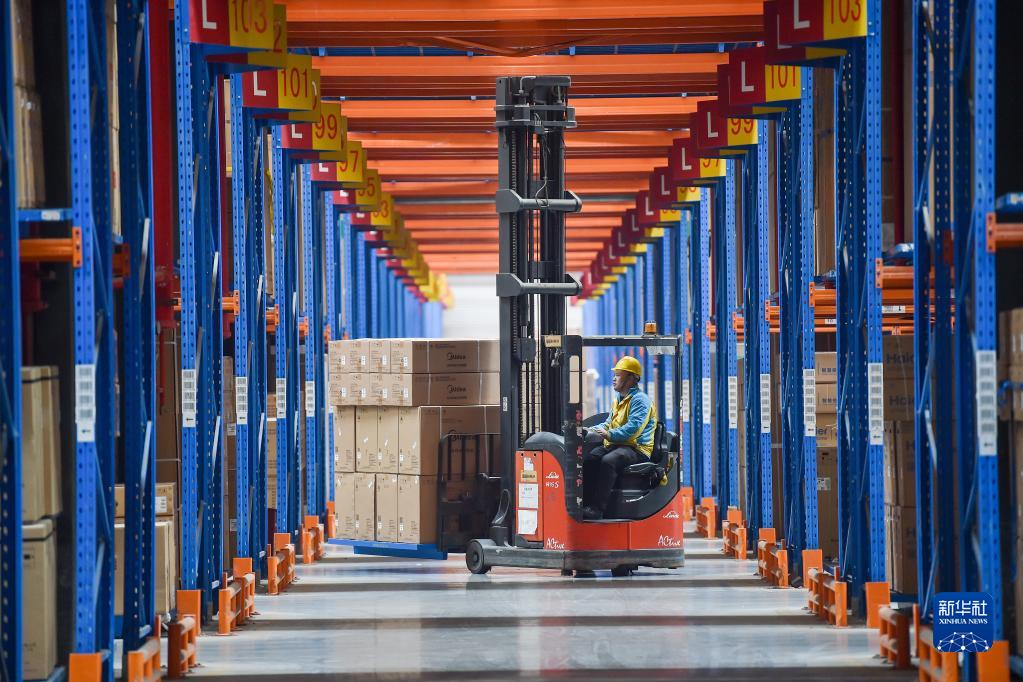 在位于江苏省南京市江宁区的苏宁华东物流中心,工人驾驶叉车搬运商品(2022年11月10日摄)。(方东旭 摄)