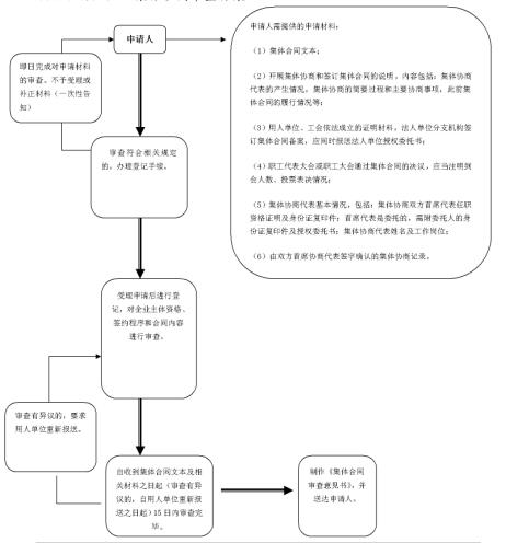 1.受理责任:受理企业提交《集体合同文本》等材料,对其材料的齐全性、内容的完整性进行查验。符合要求的,直接受理。不符合要求的,一次性告之原因及所需补充的材料或需要调整补充的具体内容。