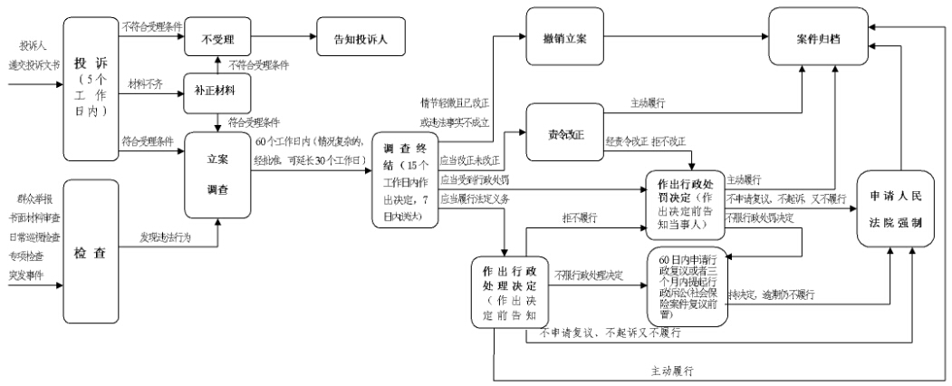 1.立案责任:通过巡查、专项检查、书面审查、举报、投诉、其他机关移送等,发现用人单位违反劳动保障法律的行为,予以审查,决定是否立案。对符合条件的投诉,应当在接到投诉之日起5个工作日内依法受理,并于受理之日立案查处。